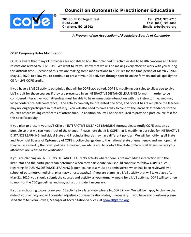 Due to the mass cancellation of in-person CE events, ARBO/COPE are temporarily loosening their restrictions on what they consider "Live" CE.